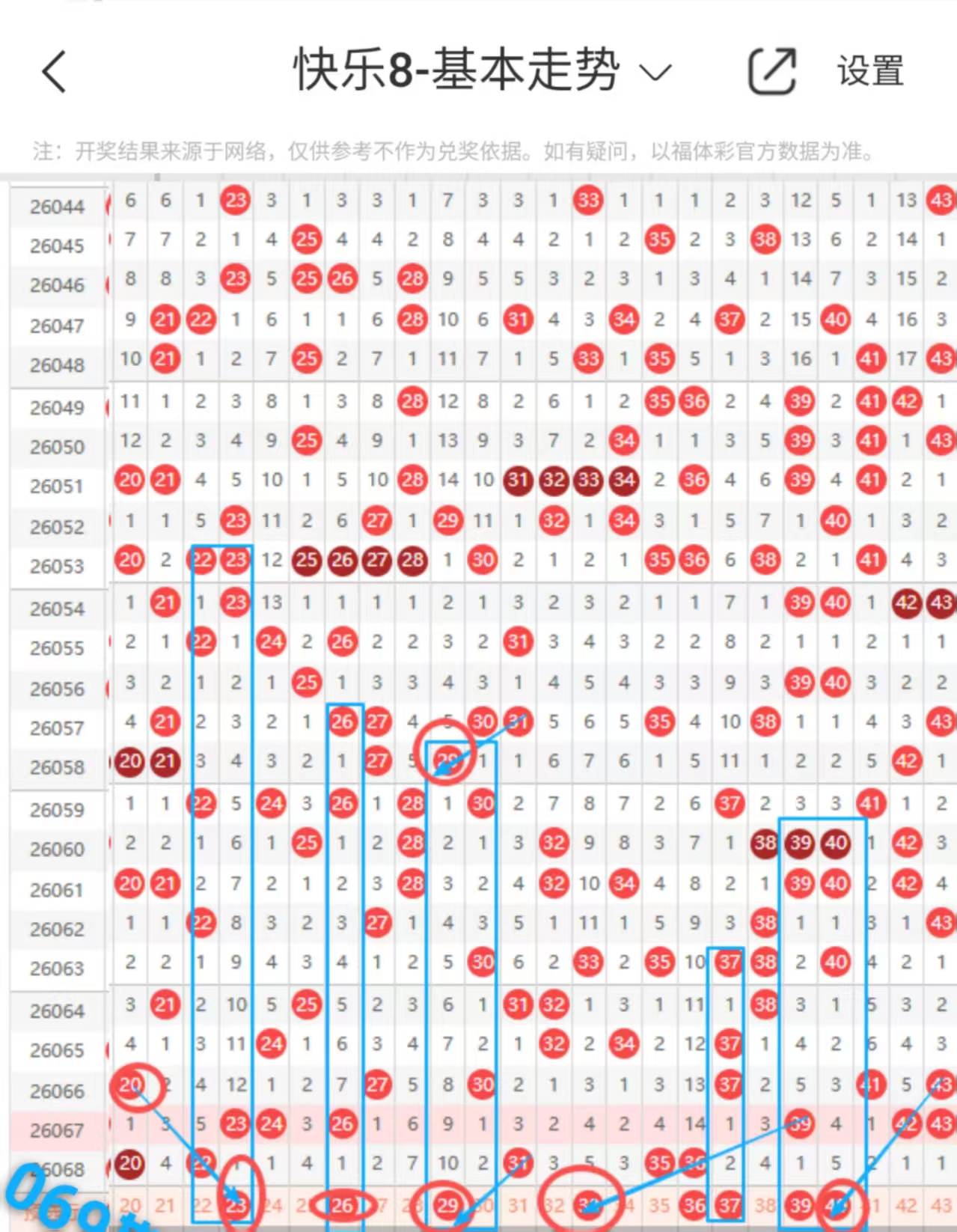 39 40号:这两个号码本期是二选一的下落走势的,看好40号顺子跳格斜连对称下落的走势的。