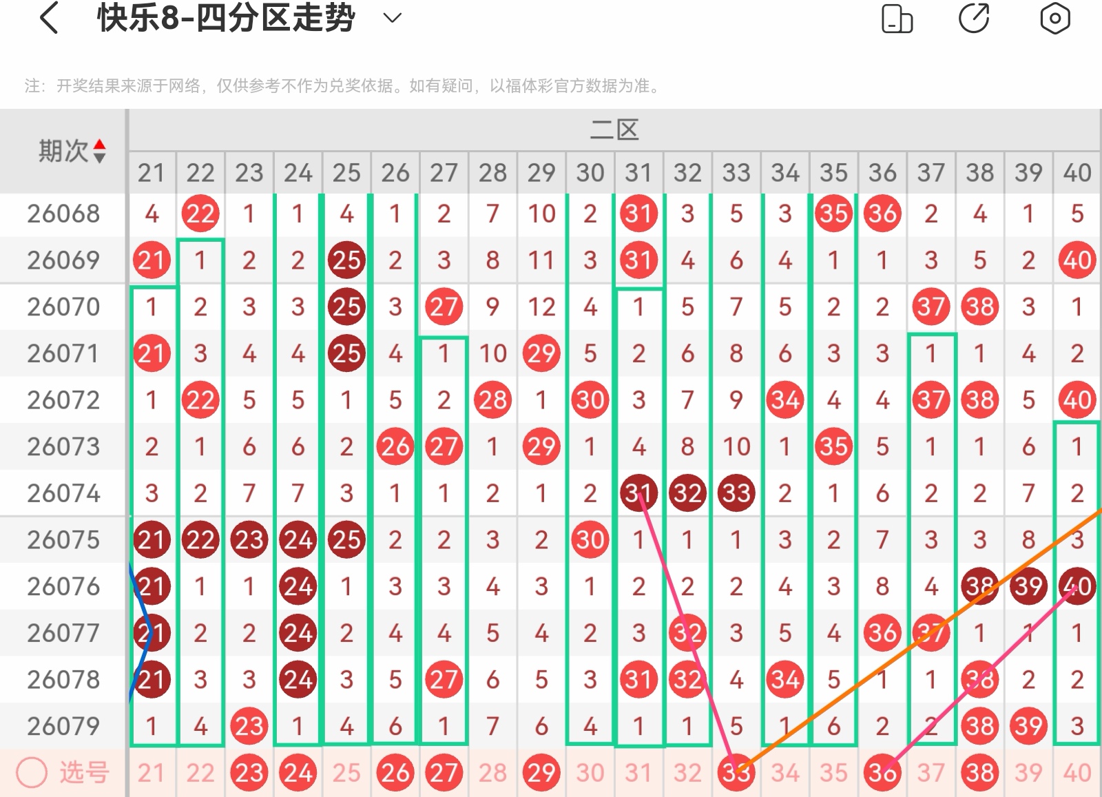 上期开出码,区间不稳,本区防3-5码开出。上期重号开出一码本期重号防一码开出,注意23.38开出重码的可能大遗漏号28上期形态走势开一码,本区形态走势有:21.22.24.25.26.27.30.31.32.34.35.37.401-3码, 重点关注26756走势,27241走势,35446走势以及37142走势,小防25434走势以及32821走势上期空位走势开出一码,本区空位走势有:空一40,共一码防上期斜连走势开出一码,本区斜连走势有三斜连22,四斜连40,共两码防本区注意重号、连码以及空位号码,隔期号码回补开出。
