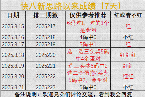 大家好,我是作者心想事成,1周成绩7次红5次,金蛋红3次,号码红5次,选二头奖红3次,选三头奖红1次,表现可以,有小爆发,继续加油。