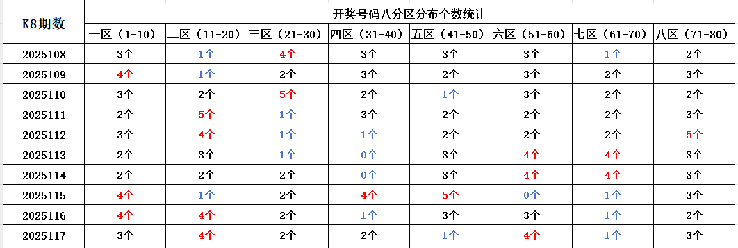 如图,红色字体是热号区,区间开出4个及以上号码。蓝色字体是冷号区,区间开出1个及以下号码。以近10期为一个分析周期,持续走热的区间:一区、八区。持续走冷的区间:四区、七区。依据久热必冷,久冷必热的规律,本期重点关注:一区、二区、六区,区间可能开出2-3个号码。四区、七区,区间可能开出1-2个号码。个人分析,仅供参考。