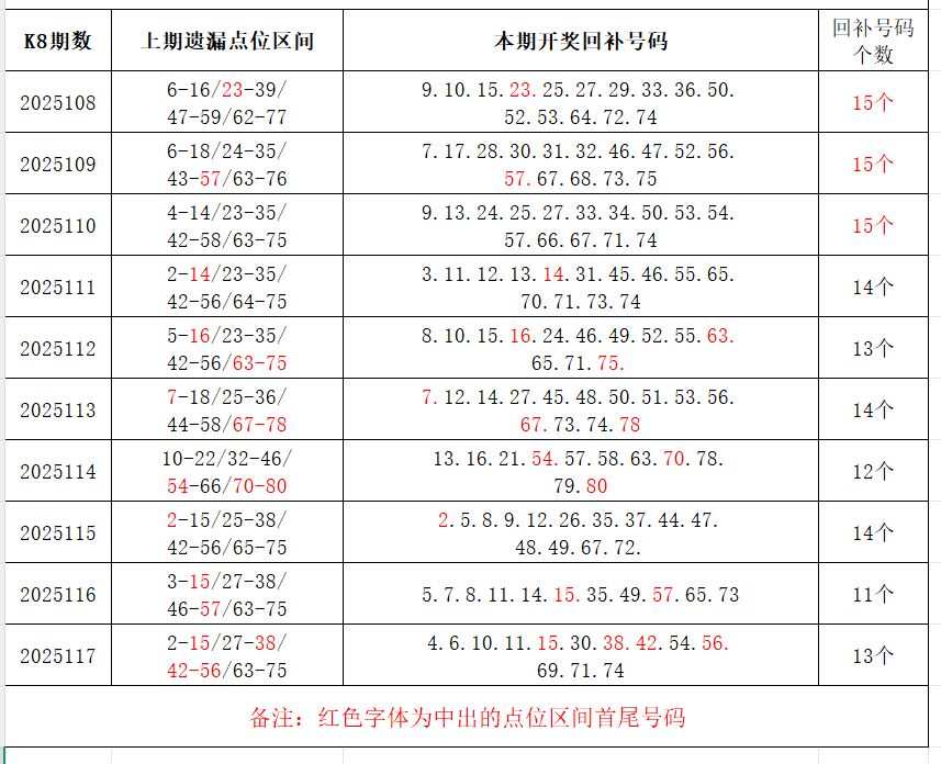 如图,上期的遗漏号码在下期开出10个左右,即为回补号码。定准点位区间首尾号码是关键!以上期2025117期(会员专区数据)为例,定位4个遗漏区间,围13码!结合上期开奖号码,以跨度值大于或等于7为依据,本期关注4个遗漏区间:23-30/30-38/42-54/60-69;重点关注遗漏-区间:****(会员专区可见),区间遗漏号码可能在本期回补开出。注意区分遗漏区间回补号码和大底号码,不要混淆。个人分析,仅供参考。