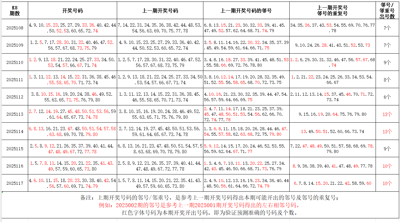 如图,红色字体是上期邻号、邻重号在下期开出,每期开出10个左右。上期邻号开出5个,邻重号开出5个。本期参考邻号:3.7.9.12.14.16.17.21.22.24.29.31.37.43.53.58.59.61.68.72.73.75.78.80;邻重号:5.10.11.19.39.41.55.556.557.70;个人分析,仅供参考。
