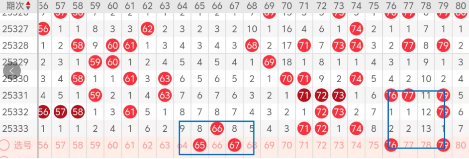 第四区间的走势分析:第四区间上期开出了四个号码球,主要的落号点位在四区间的中间位置,走出了一奇三偶的形态走势,上期四区间的前半区落下了一个号码球,后半区落下了三个号码球,整个四区间处于走冷的趋势,根据四区间的走势规律,今天的四区间我们主看四区间前半区边码65 67的落位,都是隔8期的好球回补,再看后半区76 79的回补,走出了对称的形态走势,这四个号码球建议大家打个Siam复三,或者打四码复二个比较稳妥,注意67 76组合的落位!大家参考为主!