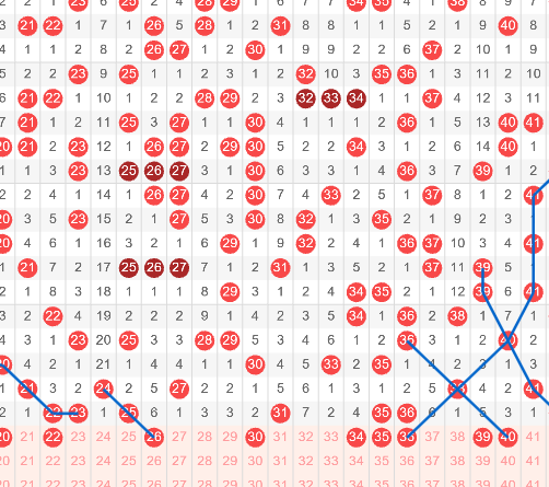 22 26今天这个是形态号,也有机会开出一到两码的,22 26 30它是一个非常漂亮的三选一点位的一个号,30的点位今 天我比较喜欢,34 35 36很可能会开出一码;其中39是一个百期规律号;35 36 39今天关注三码组合, 是个同区间的热形态,39 40这里看的是有机会开出一到二码组合;