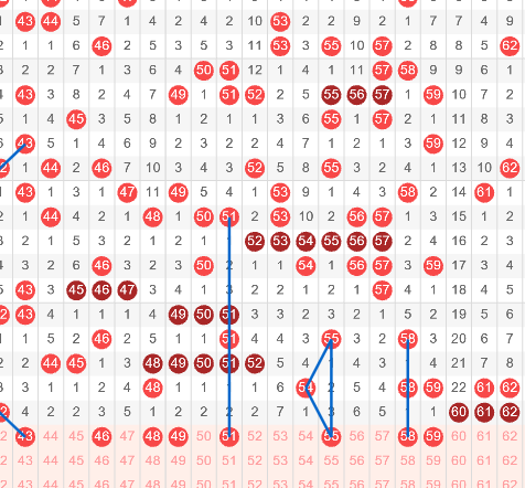 43 46这是一个长斜连的号,看好的直接取一码当胆;48 49 51看的是选一的位置非常稳,也有一点机会开出51 55二码组合,今天4头看组合号;55 58 59今天有机会开出一到两码组合值得关注;58 59的对子是有机会开出的;