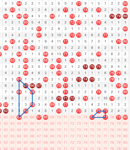 67 68 今天是二选一的点位,这种热形态,也有小概率开出64 67二码,是往期热组合;75 77 这里是一个二选一的点位,75 77今天是形态号,这里选择做一到二码;79 80有机会开出对子的点位,80有机会当凤尾;