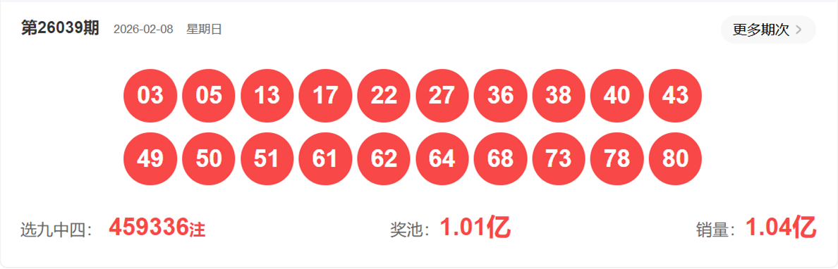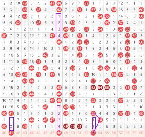快乐8第2026040期41-60区域推荐的推荐的第一个号码是41号,他是一个间隔18期的大一路,然后上面是间隔2,下面同样是间隔2,同时看到43,学者开出41来。然后就是48号一路对称走势,上面是三个48,间隔四期给出了48,下面的走势是完全相同的,同时48我们看到还具备一个从60、46间隔一出47,再间隔一出48的走势。最后就是53号它的走势和43号的走势是完全相同的。