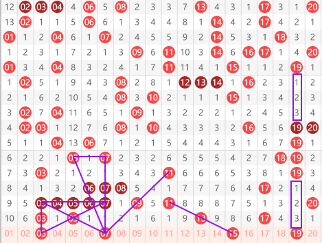 快乐8第2026040期01-20区域,推荐的第一号码是03,大家看下图,上面是个5码横连。开出来03和05,这个时候考虑03继续三重,形成一个直角三角。然后就是07号,我们看到它本身有一个倒三角一直没开出,同时又有一个03,间隔一开出05,再间隔一开出07的走势。然后他还具备一个11到07的间隔一斜连;15号的走势是;11间隔一开13,再间隔一开15的走势。最后就是19号的一个上下间隔对称走势。