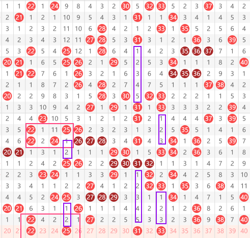 快乐8第2026040期20~40区域,二区推荐的推荐的第一个号码是22号,大家看红色方框标注上面25和22同开,然后带了一个22,那下面考虑同样开出22和25两个号码。25是一个间隔2的连贯走势。下来就是31号的上下对称走势,还有33号的。间隔对称走势。