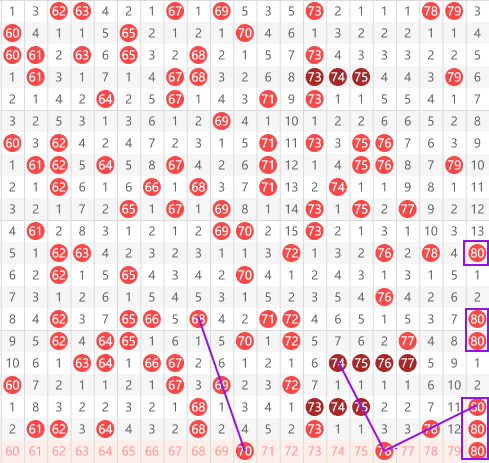 快乐8第2026040期61-80区域的推荐的第一个号码是70号,一个间隔斜连看到68,间隔一出69,再间隔一出70的走势。然后就是76号,它本身是一个间隔,一间隔2,然后间隔3的走势,同时我们看到74间隔一开出75,再间隔一期给76,而旁边的80间隔一期给78,再间隔一期给76。两重走势。然后就是80号,看他走的应该是两重加三重。