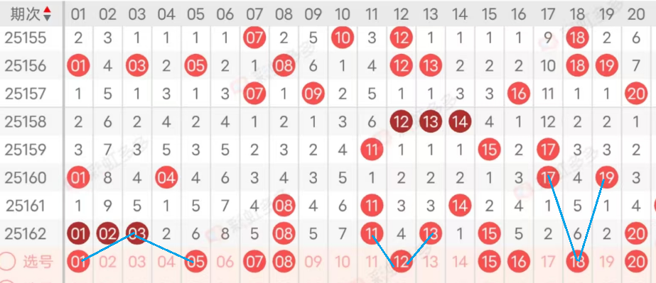 第一区间的走势分析:第一区间上期开出了八个号码球!主要的落号点位在一区间前半区和后半区的龙头位置。根据一区间的走势规律!今天的一区间我们首先关注前半区的01 02 03 08这几个号码球点位的落号!防守01 08 有继续走重的可能,然后关注它们之间的号码04 05 06 07这几个号码!应该不会太多!落下一码的可能很大。不管08走不走重09 10落下一码的可能很大。后半区的11 13 15 20这四个号码球!应该有2码走重,然后关注它们的夹码12 14 有一码落下。15-20之间重点关注16 18 这两码有一码落下。