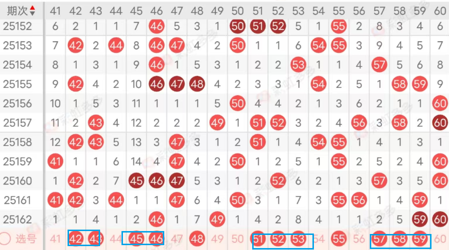 第三区间的走势分析:第三区间上期开出了四个号码球!主要的落号点位在前半区的凤尾和后半区的凤尾位置。根据三区间的走势规律!今天的三区间我们先关注前半区龙头位置附近的号码!41 42 43应该有一码落下!46 49防守有一码走重!然后关注它们的夹码47 48以及分边码44 45 50这几个号码球!应该有2码落下。主看44 47 和45 48的组合。后半区主看龙头附件51 52 53有号回补,在看55 57 58 号码的落位。最后防守59 60有一码继续上楼。
