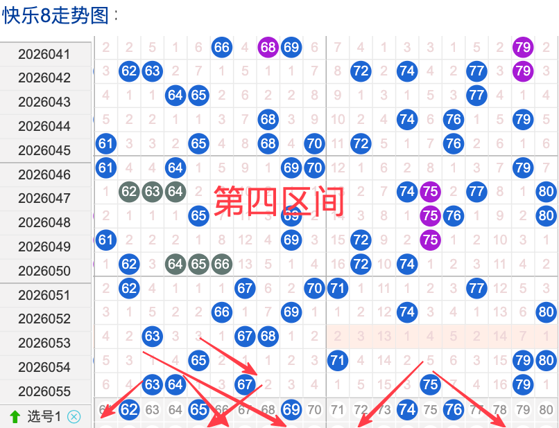 上期四区间开出了5个奖号(63.64.67.75.79)上期的四区开5个奖号呈现了一个递增趋势,开出的奖号7头回补2个,6头回补3个,先来看号码62在近 30 期内属于还是很稳定的号码,近期出现频率相对较热,偶尔会间隔多期后出现一次,这个号码要注意防守,号码65具有一定的间歇性近期活跃度还是很稳定比如有时会间隔3到5期就再次出现,也有时会间隔多期,近期整体出现频率比较热,近期还是要关注的.号码74活跃度近期比较好,有一定的间歇性。活跃度近期较稳定,整体走势有一定的波动性.