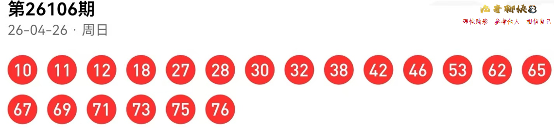 26107期预计播间主讲大底: 02 04 07 11 14 21 23 25 27 33 34 37 42 43 44 49 51 55 56 64 67 73 77 80;
