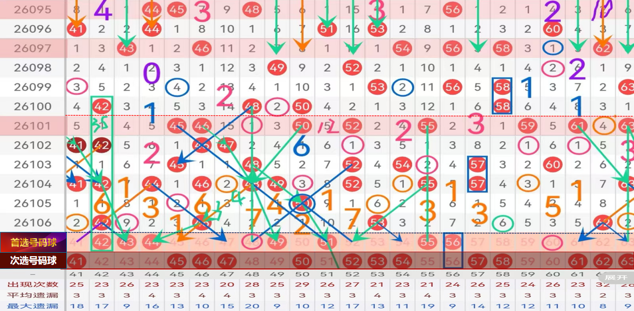 三区间推荐主做号码:42 43 44 49 51 55 56;防守号码:48 60;