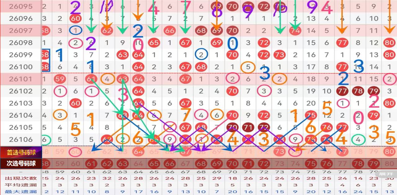 四区 间给到主做号码球:64 67 73 77 80; 防守号码:74;