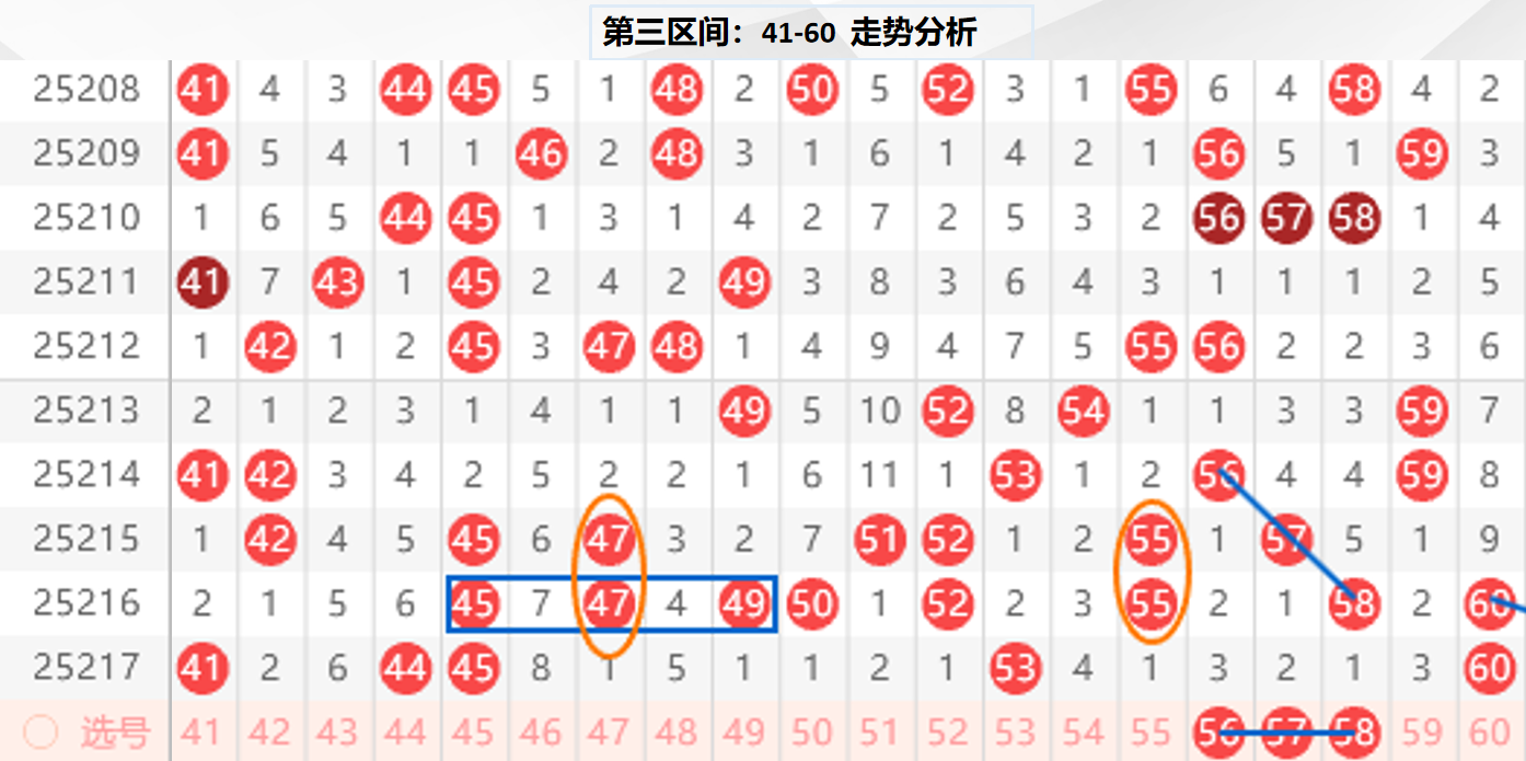 三区分析:【41-60】(走势图标注号码非小黄车大底,请谨慎参考,具体思路将在直播间分享讨论)