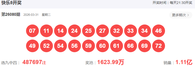 快乐8第2026080期开奖号: