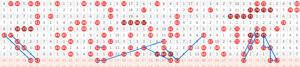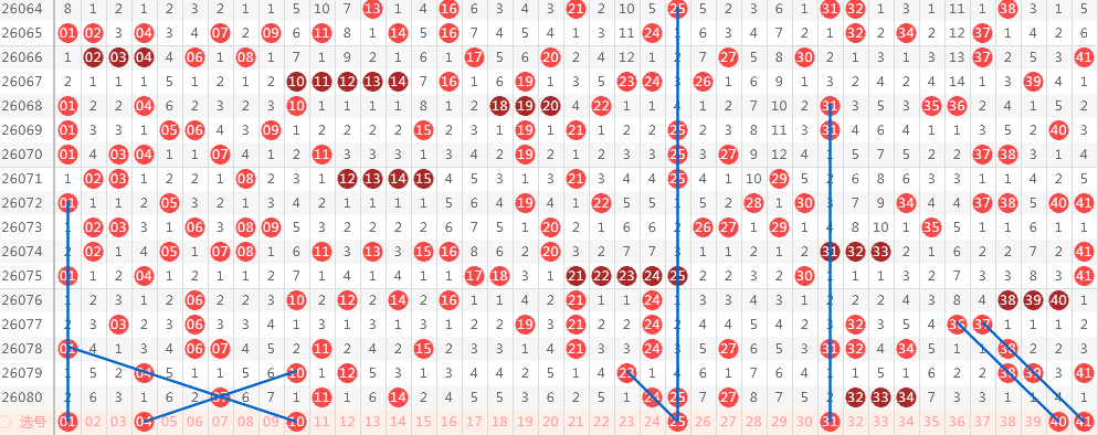 【第二区间41-80】:上期开出11个号码。本期推荐:41-50-51-61-62-72-76-77八个号码。41一大区间已述(对子等距斜连)不再赘述;50-51各有走势,50斜连、51同路,重点把握对子夹号;61-62同为斜连号码,在上期三连号码开出后,以二连持续延续开出形态;72与79期奖号60形态相同,为重点号码;76-77等距斜连对子,同时,76为“闪电”特别形态号,77三斜连号码,看好对子在7头回补(注意:本期斜连等距对子号码推荐2个,即40-41和76-77,建议取其一即可)。区间推荐重点号码:三小区间41-50,四小区间62-72-76。
