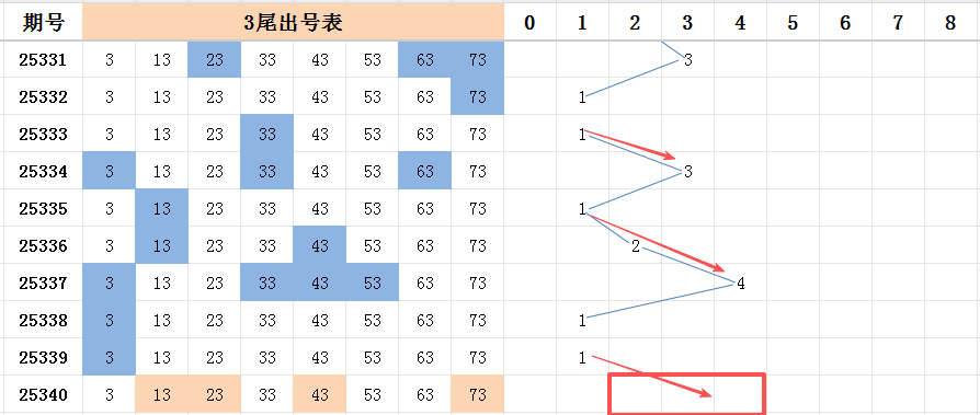 本期看好号码开出的范围是两码走势至四码走势之间。上期开出的尾号中,围中6尾,开出四码走势。本期依然看好的是今年的热尾号码。当然也可以像上期说的那样,可以转变一下思路,选择今年的冷尾,可以考虑冷尾进行回补。