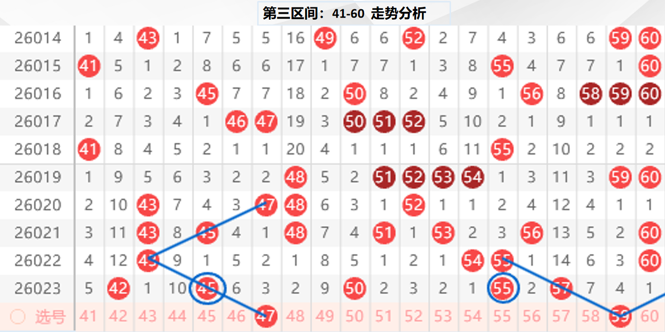 三区分析:【41-60】(走势图标注号码非小黄车大底,请谨慎参考,具体思路将在直播间分享讨论)