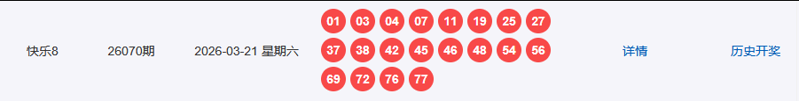 1、开奖号码:01 03 04 07 11 19 25 27 37 38 42 45 46 48 54 56 69 72 76 77