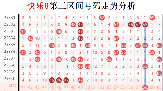 三区上一期在一码的走势回补下,整个而区间全部以空降的形态回补,遗憾的是后端依旧放空,在前半部分回补叾空降的假五连走势。对于本期来讲三区是彻底放飞自我的布局,一切就靠运气了。三区走势虽显涣散,然《易》有云“穷则变,变则通,通则久”。当形态走到极致之时,恰是转机萌发之始。本期三区或借势完成从散到聚的蜕变,重点关注45与48的中轴支撑作用,辅以冷号51、56试探边界张力。斜连走势有望在47-49区间重现,形成小范围聚集。凤尾59虽未现身,但58已有松动迹象,谨防末端突然发力。结合轮动节奏,适当布局42与57作为分边锚点,力求在混沌中构建有序脉络,捕捉逆势突围的可能。
