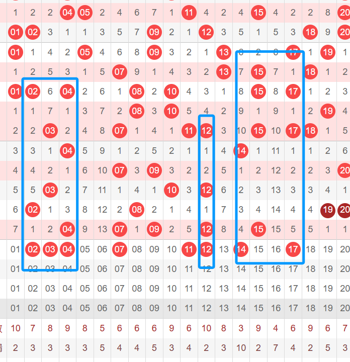 那么现在呢,我们对快乐8游戏第215期分为四个分区进行分析,那么01~20为一分区,那么上一期一分区共开出了5枚号码,本期的一分区我们重点关注重号。以及斜连号码,那么重号的话,大家要关注04和12,其次啊,关注07,重点关注04和12作为一分区的两个重号。那么组合的话,我们根据我们的组合原理,然后把这个234作为04的组合,把这个12.14作为12的组合,那么还要关注一个号码,就是17号啊,有可能会形成 14.17的这样的组合