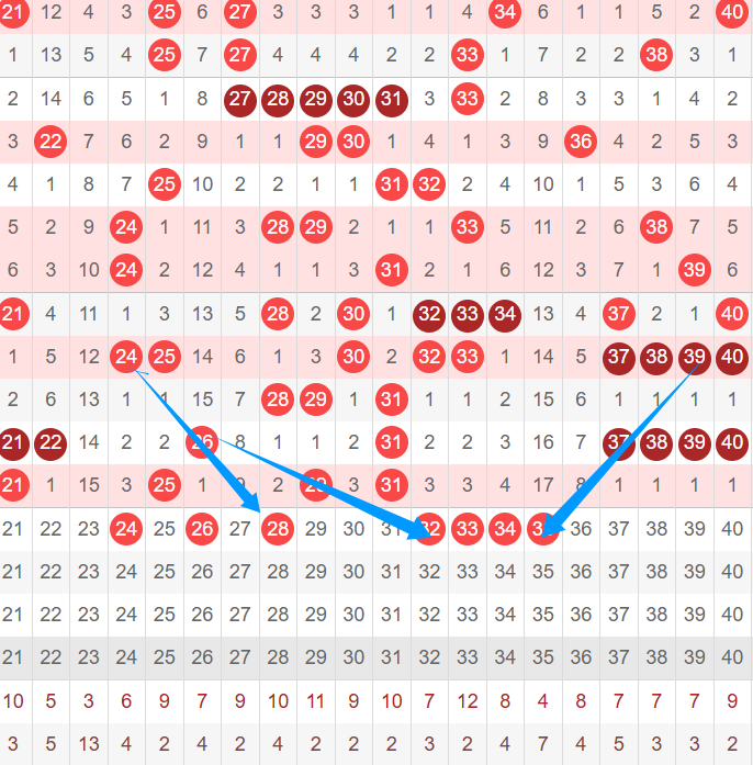 接下来我们看一下二分区20号到40号之间,这个分区上一期也只开出了四个号码。本期二分区啊,应该是一个重点的一个区间啊,可能会有产生三连号甚至四连号。那么二分区的号码,我们从走势图上可以看到,斜连号24,还有这个28,包括32.33.35它都是属于序列号。重点二分区关注的号码一个是28号一个是32。32号的话有可能会形成连子号码,大家要重点关注一下。