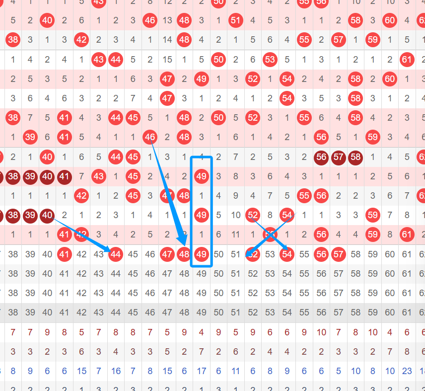 那么现在我们看一下三分区40号到60号之间,那么上一期开出了5个号码,本期三分区的号码也会在42~53这个区间进行回补。那么重点的话是关注4字头的号码。那么4字头上一期只开出了两个,本期四字头有望开出3~4个,重点关注重号41号以及四十七四十八四十九