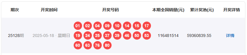 | 2025128期 | 25 | 37 | 39 | 46 | 50 | 53 | 60 | 63 | 76 | 80 | |