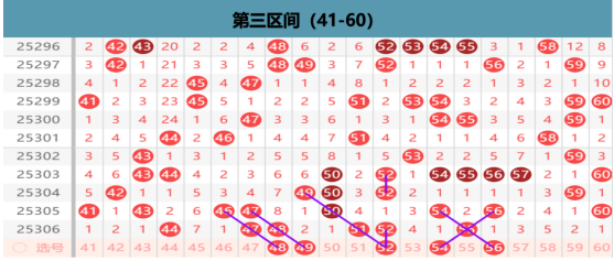本区上期开出6码的区间布局,那么在本期我们要考虑的点位就是同路下方的出号重点,优先考虑的是分边的出号,而且同路我们不能慢性太的看出号的点位,区间上的同路大概率是又放空的点的,那么形态上放空的就会比较的多,所以空位上我们也是要做做号选择的,小周期41 42 57 59我们要去做择一的选择,其他位置上就不是我们考虑的重点位置了。