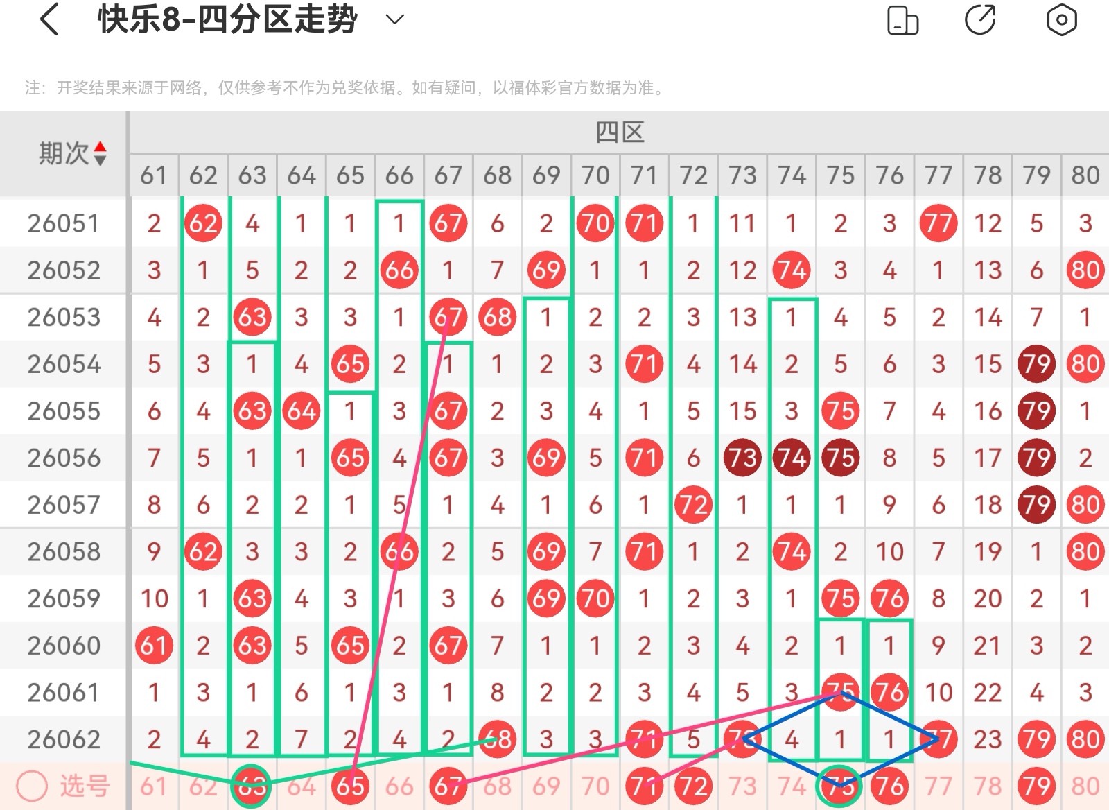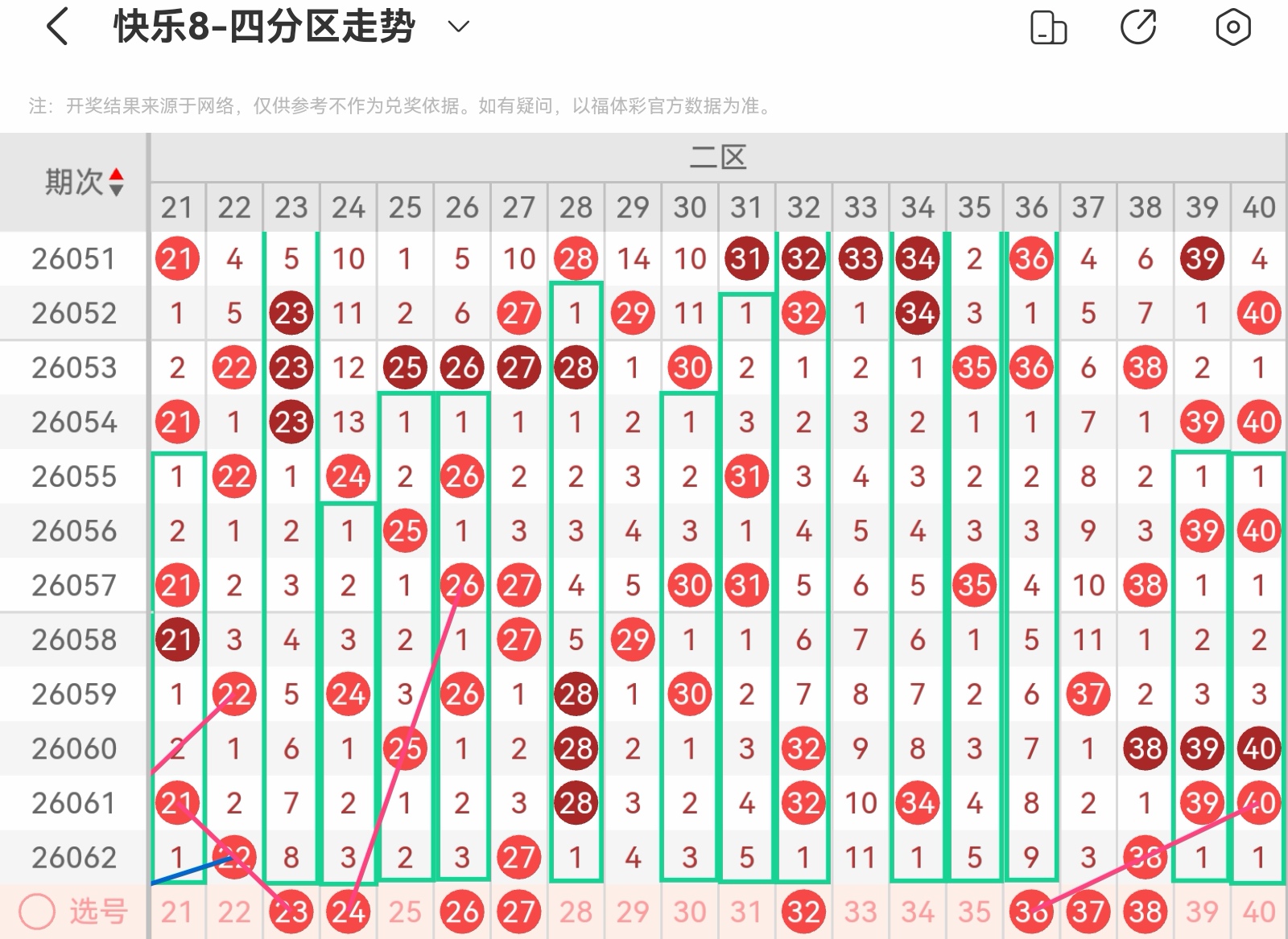 大家好,我是甜丝丝的坏事,主要以快乐八的形态走势、空位走势、遗漏走势以及斜连走势相结合的方法,用公认的四分区走势来进行预测分析,希望能让你有所收获。