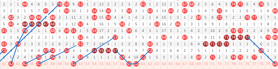 【第二区间41-80】:上期开出10个号码。本期推荐:42-44-46-51-59-60-80七个号码。此号码段近期偶数二连开出频繁,我们就顺势而为,看好42-44-46偶数三连号码开出趋势;51同路三期号码,又菱形边号,重点考虑;59-60夹号对子号,属于明号;80斜连号码,又为遗漏一1-2-3形态,作为防守。区间推荐重点号码:三小区间42-44-46-51,四小区间80。