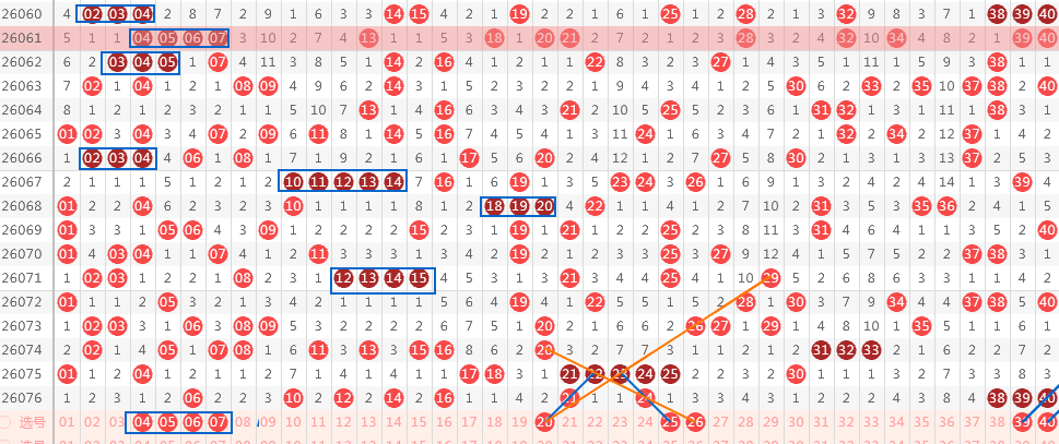 【第一区间1-40】上期开10个号码。本期分析推荐:04-05-06-07-20-25-26-39-40九个号码。0头近16期开出至少三连及以上号码7期,几乎有一半都开出连号,所以,本期大胆推荐四连号码04-05-06-07,且大家可以仔细观察,它们各有走势;20同路四期和斜连号码,与斜连号码25形成两边延伸出号趋势,这种形态常见;26偶数四连,和25组合对子在此号码段回补;39-40除它们本身斜连和同路走势外,还要考虑上下对子重号复制形态。区间推荐重点号码:一小区间04-05-06-07,二小区间39-40。