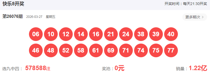 上期锦上添花胆48中 大底16中7 凯哥快乐8第2026077期号码分析