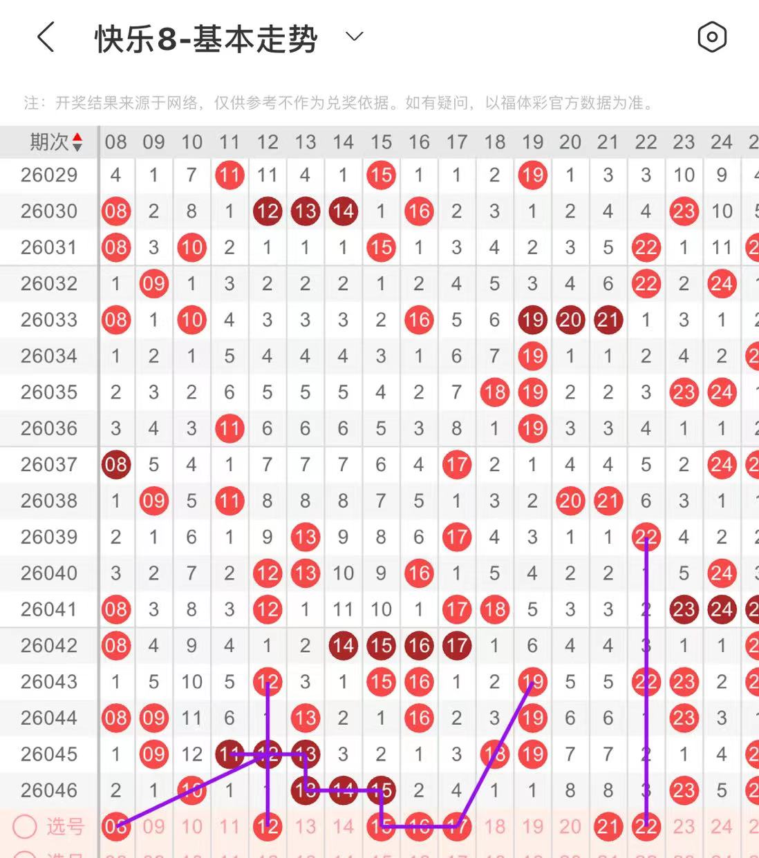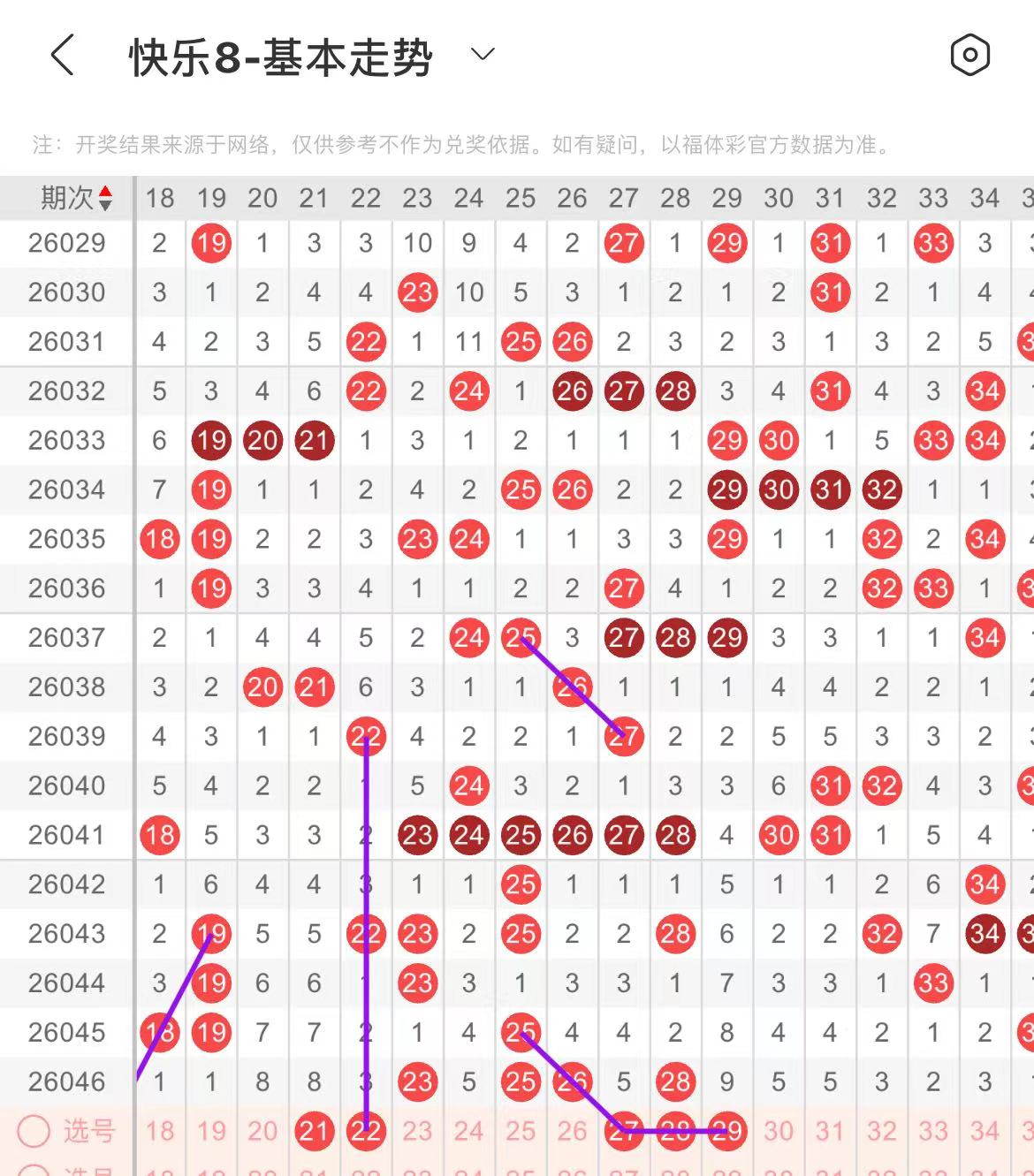 21-30区:本区间上期开出了四个号码,从号码走势图上看,本期号码走势比较强势,出号个数应该还能保持在三个号码或者以上。有出号走势的号码有22号,隔期相同出号走势,防21.22同出的可能,27号,斜连出号走势,防27.28.29开出三连的可能。