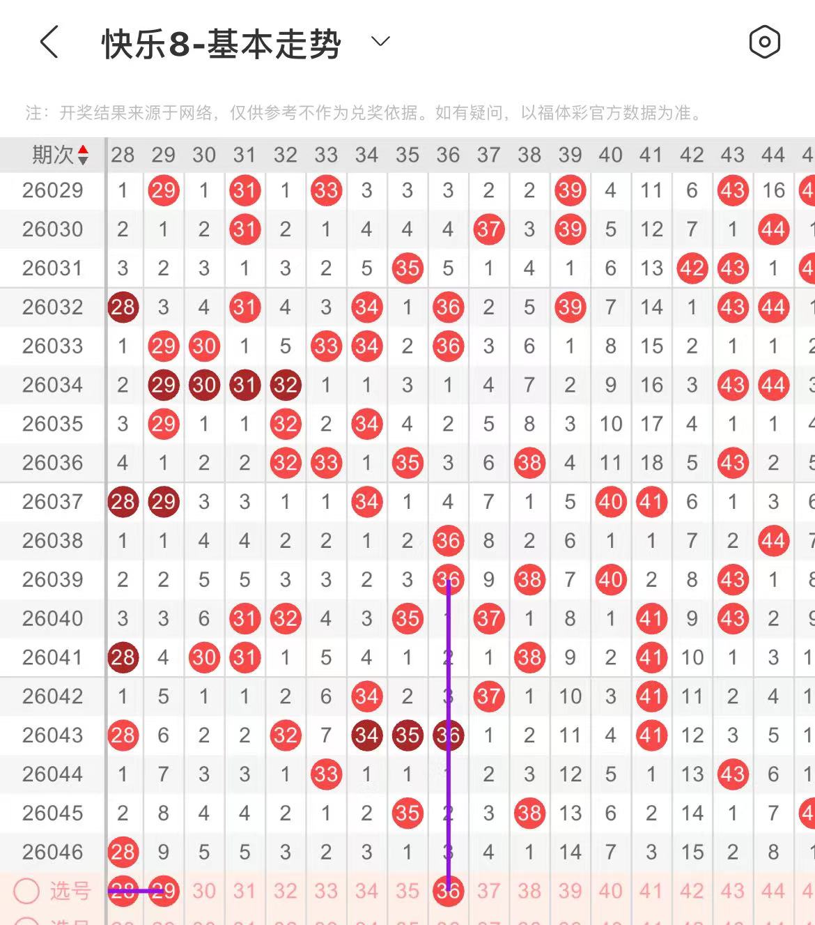 31-40区:本区间上期断区了,从号码走势图上看,该区现属于冷号区,虽然上期断区了,本期回补的号码应该不是很多,一两个号码左右。有出号走势的号码有36号,隔期相同出号走势。