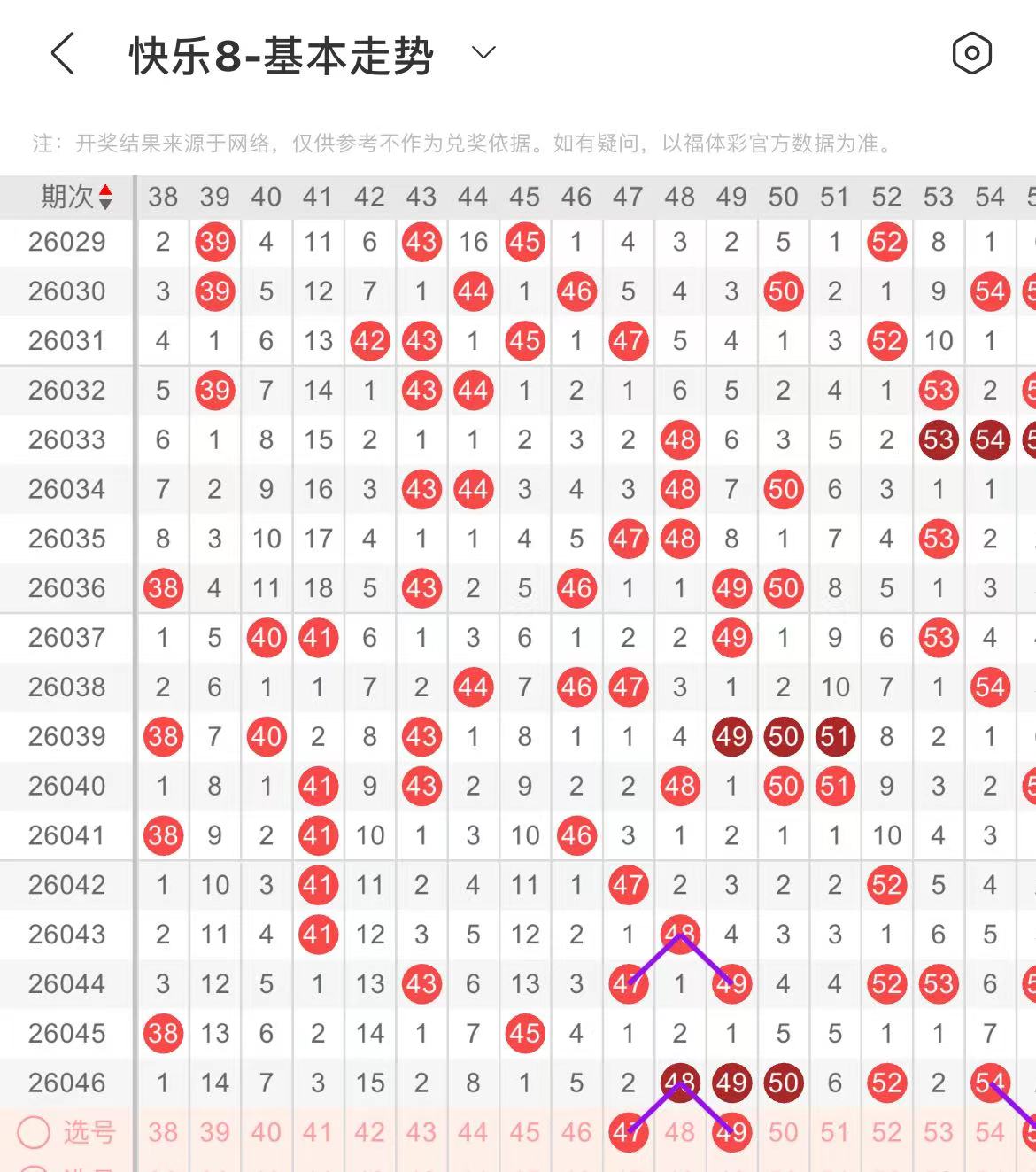 41-50区:本区间上期开出了三个号码,从号码走势图上看,本期继续关注后半区号码回补,出号个数在两个号码左右,有出号走势的的号码有47.49号,直接做分边出号考虑。