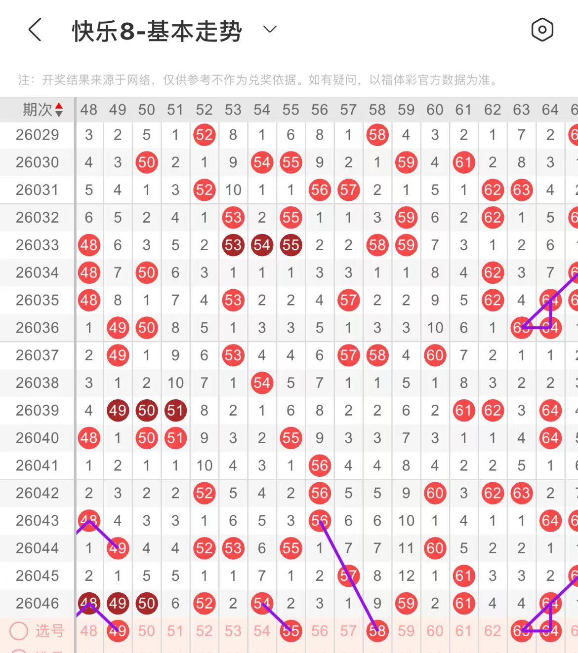 51-60区:本区间上期开出了三个号码,从号码走势图上看,该区出号个数有一定的规律性,本期注意出号个数减少的可能,有出号走势的号码有55号,做为边号开出,58号,斜连出号走势。