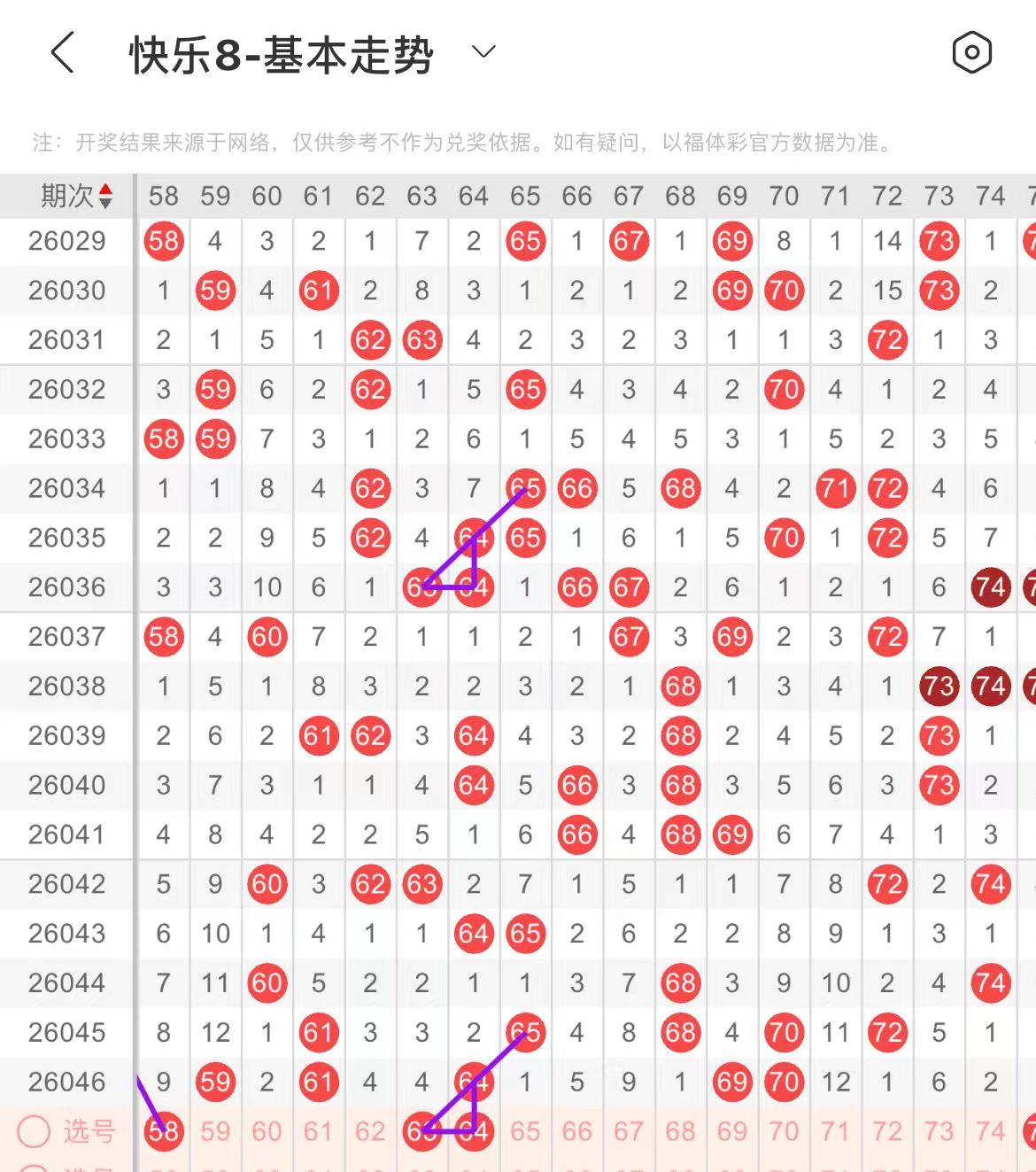 61-70区:本区间上期开出了四个号码,从号码走势图上看,该区连续走热,本期注意出号个数有减少的可能,重点关注前半区号码回补,有出号走势的的号码有63号,斜连出号走势,防63.64同出。