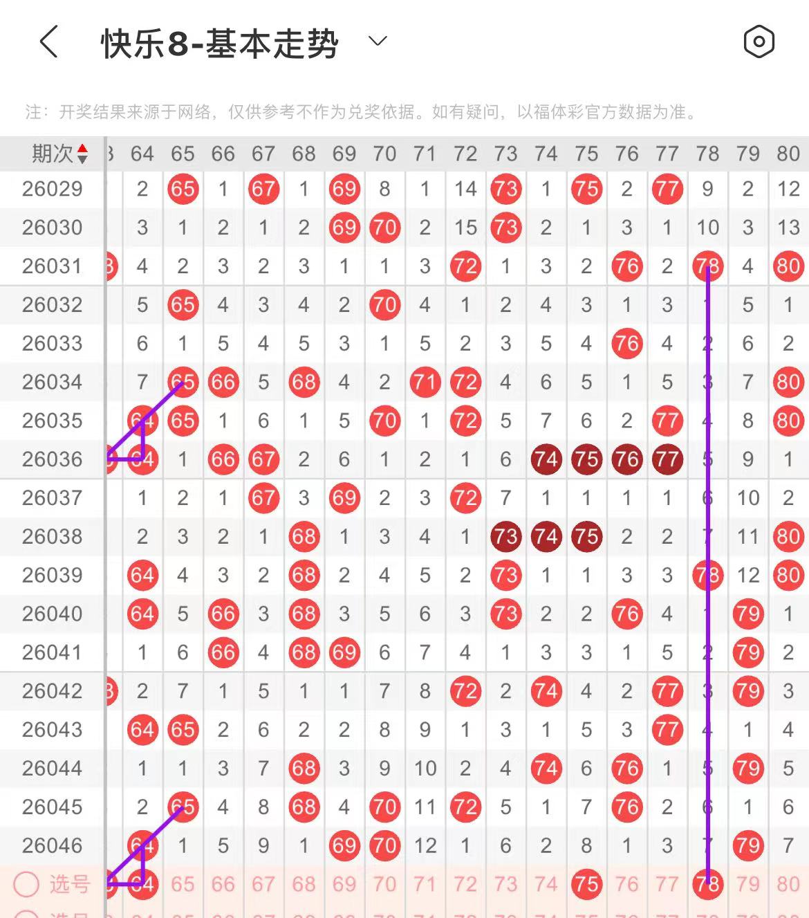 71-80区:本区间上期开出了一个号码,从号码走势图上看,该区现属于温冷区,出号个数在两个号码左右,有出号走势的号码有75号,斜连出号走势,78号,隔期相同出号走势。