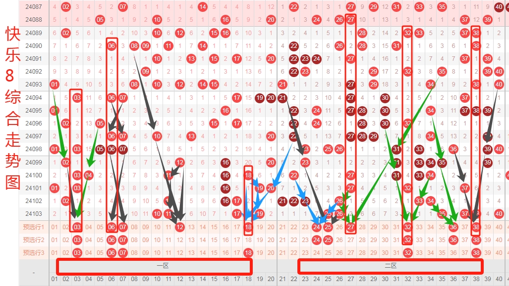 【二区号码分析(21-40)】:二区上期开出了6个号码,开出重号号码【26】,开出邻号【25 35】,开出连号【25 26/37 38】,二区奇偶比为3:3。从走势看,二区位这期出号可能要多一些,可以考虑6个左右的号码,【24 25 27 32 36 38】,重码按比例看有可能开出,主看24 25为连号,24 27 36具备邻号、斜连开出之势,36 38 25 27具有三角支撑之势,25 38具有热号回落之势。【可参照上图标记】