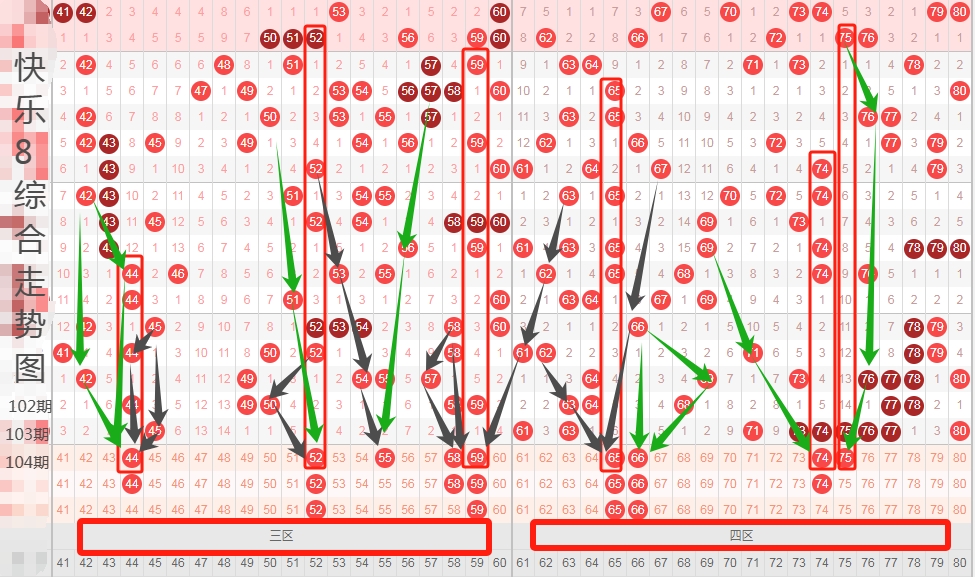 【三区号码分析(41-60)】:三区上期开出1个号码,出码比较少,区位奇偶比1:0,没有开出重号号码和连号号码,开出邻号【45】。本期三区看好5个号码,【44 52 55 58 59】,都具有分边斜连对称的关系,上期开出两连号,本期可继续看连号,本区位回防三个号码【44 52 58 】,同时52 55 59符合三角支撑之势,44 可作为斜连回落顺下的重号号码。【可参照上图标记】