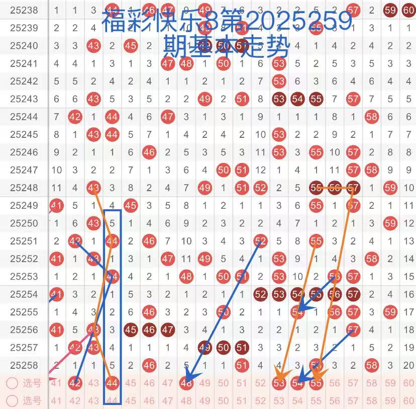 第三区间(41-60):结合近3期第三区开出号码比例6:5:4,预判本期开出号码在4到5个。42号球呈三角回折走势,44号球呈菱形回折走势,本期注意防守。48号球呈斜跨走势,防守继续回补落号。53号球呈斜跨走势,54号球呈断斜连形态,55号球呈三角回折走态,重点关注。