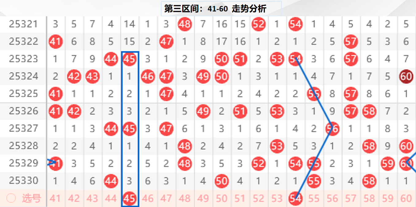 三区分析:【41-60】(走势图标注号码非小黄车大底,请谨慎参考,具体思路将在直播间分享讨论)