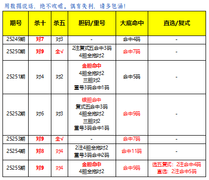前期杀10码对9,免费文章杀5码对4,4胆全拖对2,金胆命中。