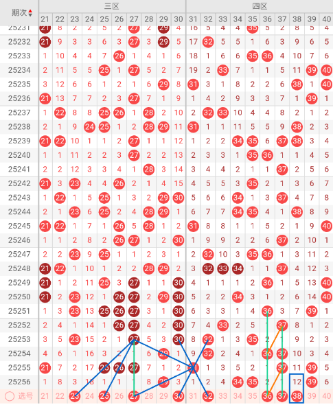 四区开出:34,35,39 奇偶比: 2:1 和值:108 跨度:5,上期开出3个号码,奇数号码占优势。本期无三斜连走势,隔码斜连走势:32,近10期平均出号2.6枚。本期推荐关注号码:32、36、37、38。