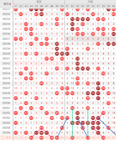五区开出:41,43,45,46,47 奇偶比: 4:1 和值:222 跨度:6,上期开出1个号码,奇数号码占优势。本期三斜连走势:44 48,隔码斜连走势:49。近10期平均出2.4枚,本期推荐关注号码:44、46、48、49。