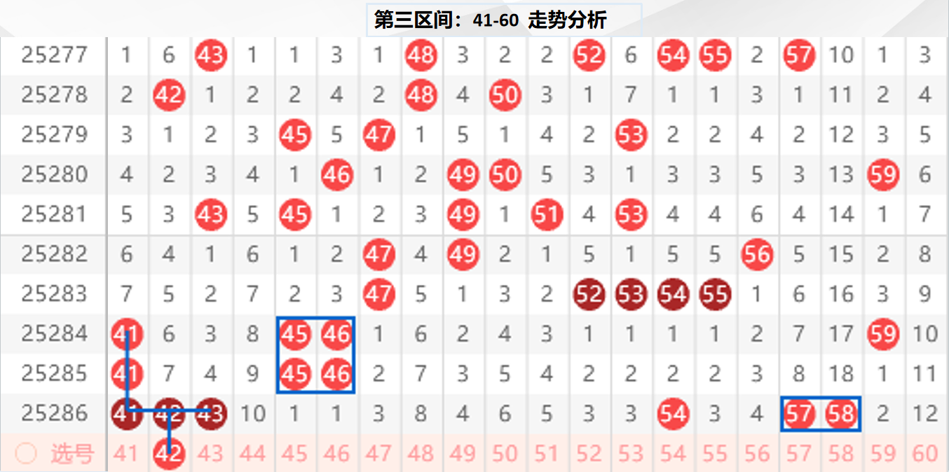 三区分析:【41-60】(走势图标注号码非小黄车大底,请谨慎参考,具体思路将在直播间分享讨论)